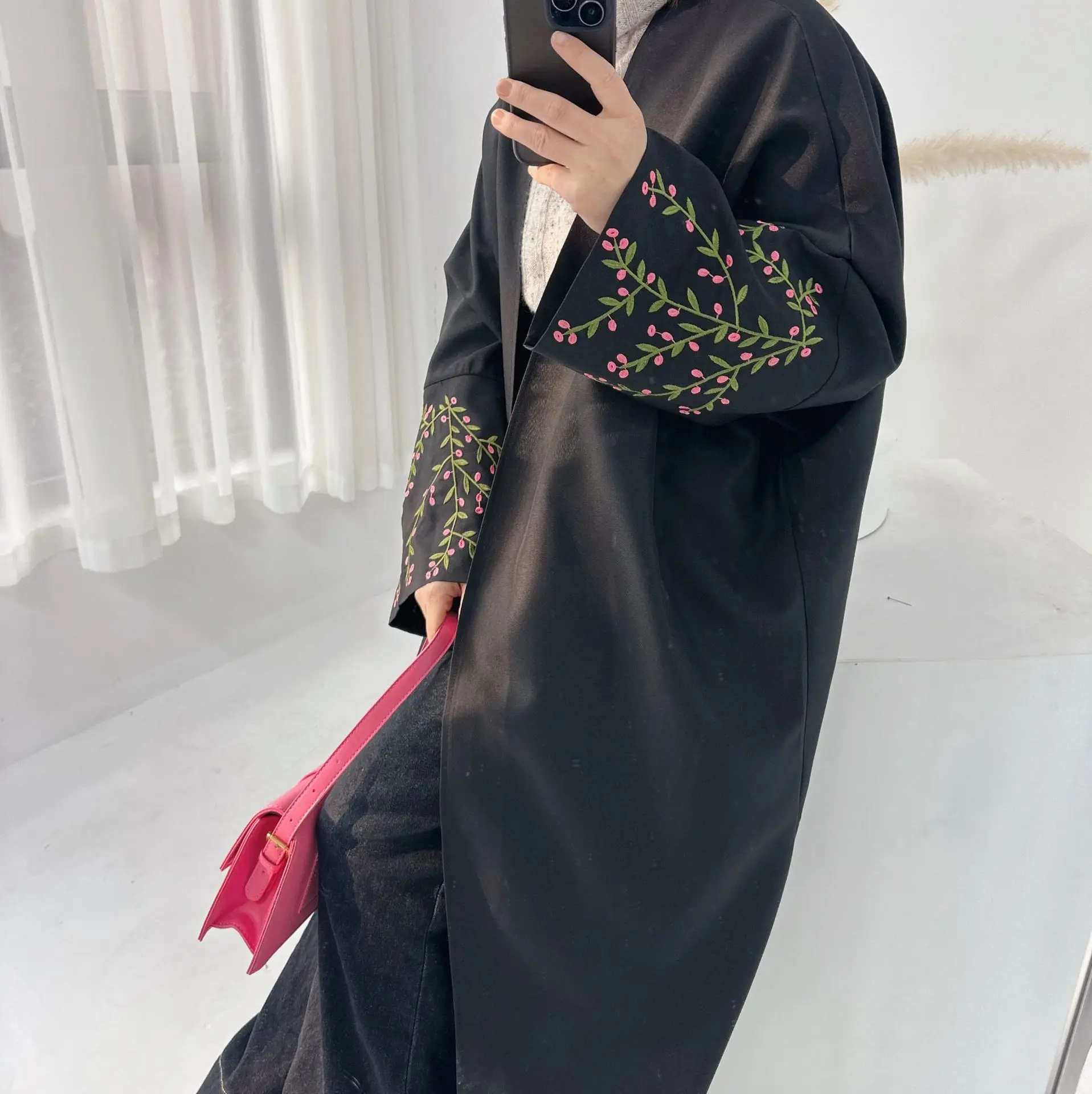 Open Front Abaya Embroidery Floral Long Sleeve Maxi Length Women’s Clothing Muslim Cardigan Abayas Out Kaftans Women Jilbabs